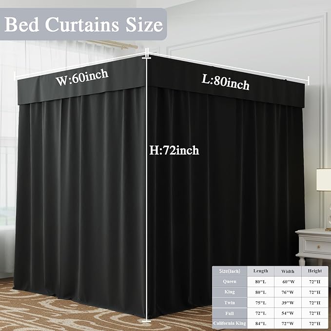 Transform your bedroom into a private, elegant retreat with the Hvqic Black Canopy Bed Curtains. Specifically designed to fit queen-size beds (60" W x 80" L x 72" H), these luxurious drapes create a fully enclosed space, offering enhanced privacy, style, and rest. The deep black tone and four-sided coverage make it ideal for those who prefer a dark, cozy sleeping environment—perfect for daytime sleepers, shift workers, or anyone sensitive to light.